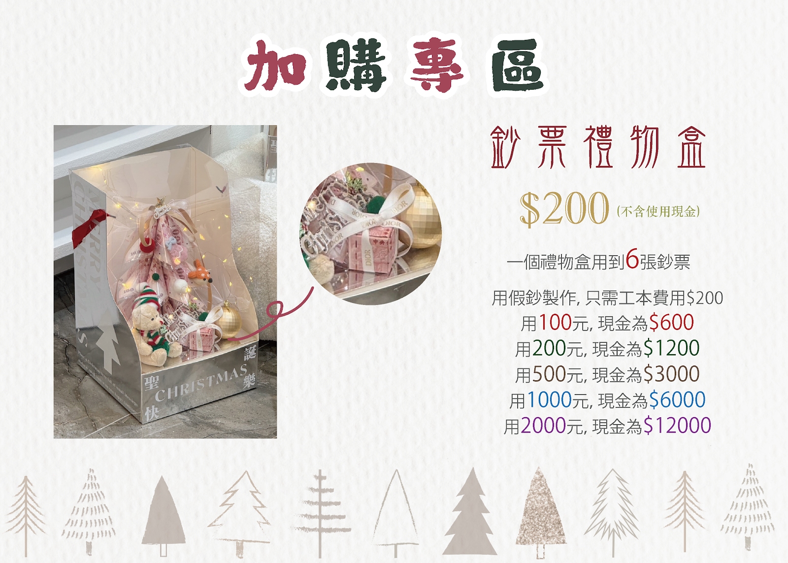 如果要加購鈔票禮物盒,加購價200