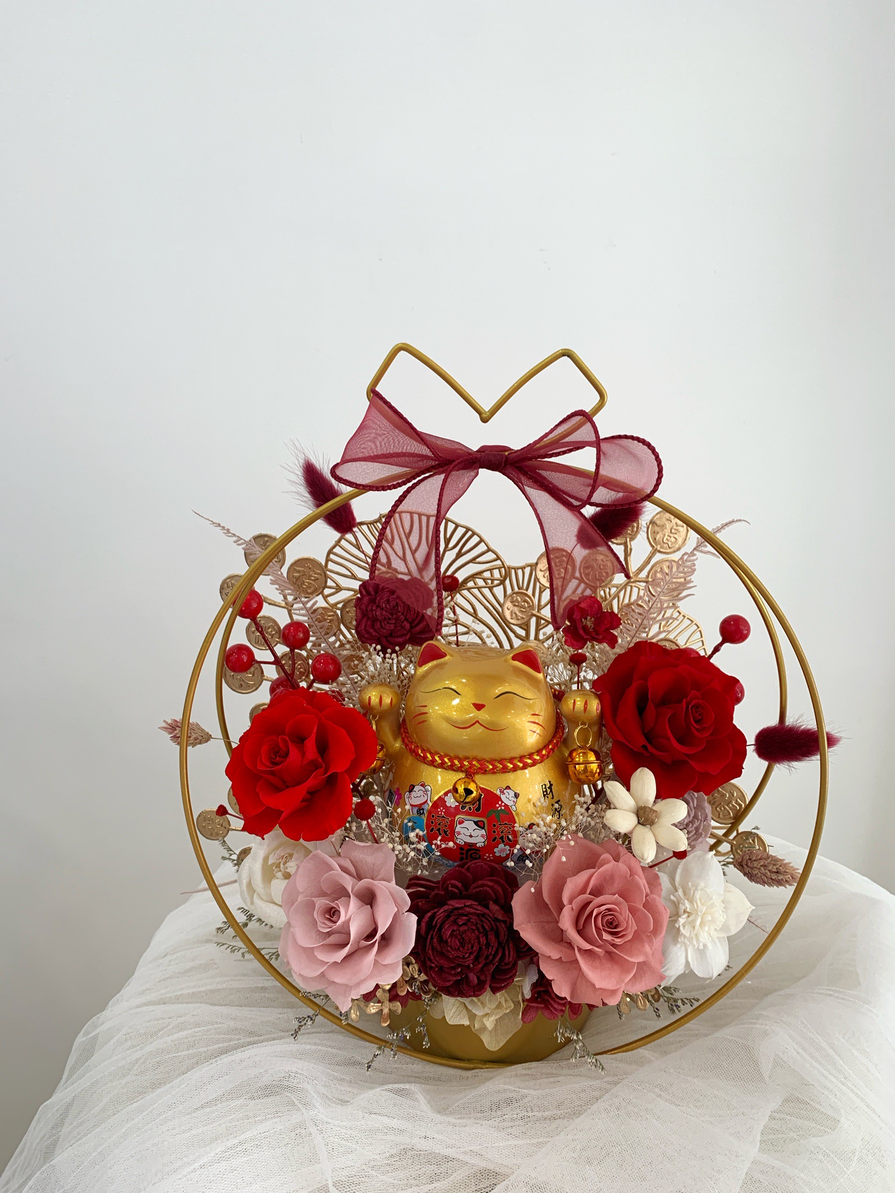 招財貓金屬圓形花禮<可代寫賀卡>